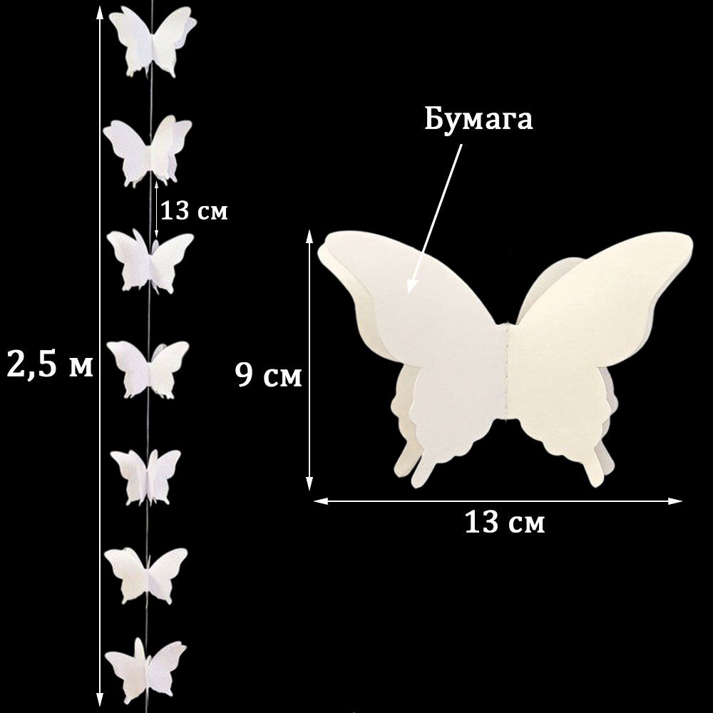Расправьте крылья и создайте праздничное настроение. Гирлянда идеально подходит для украшения детских комнат, свадеб, окон, стен и фотозон. Объемные бабочки на нитке добавят нежности и легкости интерьеру.